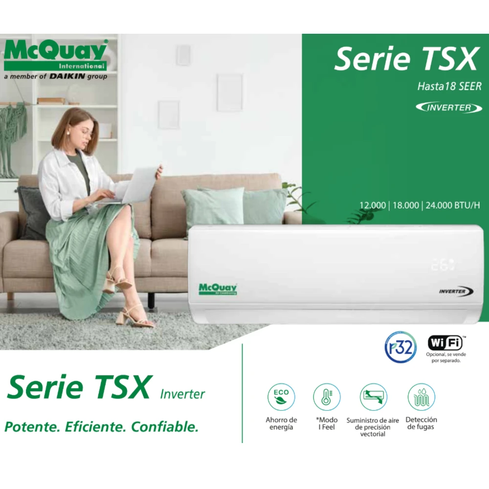 El Mini Split Inverter McQuay Serie TSX está diseñado para quienes buscan confort continuo, ahorro energético y una operación más silenciosa en aplicaciones residenciales o comerciales ligeras. Su tecnología Inverter ajusta la velocidad del compresor según la demanda real del espacio, lo que ayuda a mantener una temperatura más estable, reducir ciclos de encendido/apagado y optimizar el consumo eléctrico en comparación con equipos convencionales.