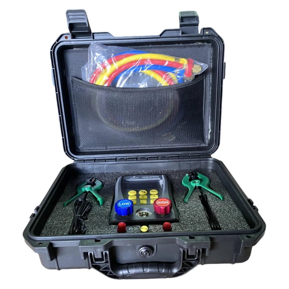 Recomendaciones de uso: • Incluye sondas de temperatura (clamp/probe) para medición de línea de succión y líquido. • Mangueras de servicio incluidas (60″) para carga, recuperación y pruebas. • Ideal para puesta en marcha y diagnóstico en minisplit, VRF ligero y refrigeración comercial.