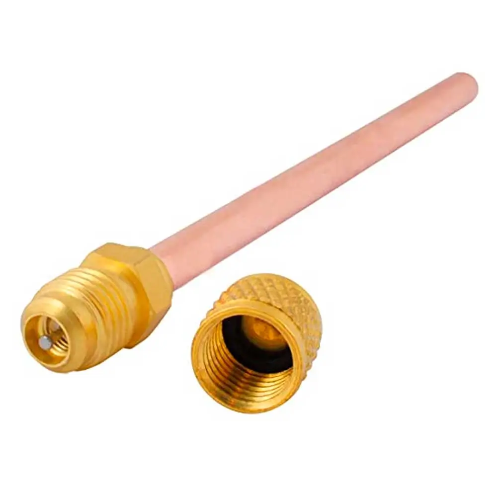 • Rabo de carga / válvula de carga con conexión **1/4″ SAE** para servicio HVAC/R.